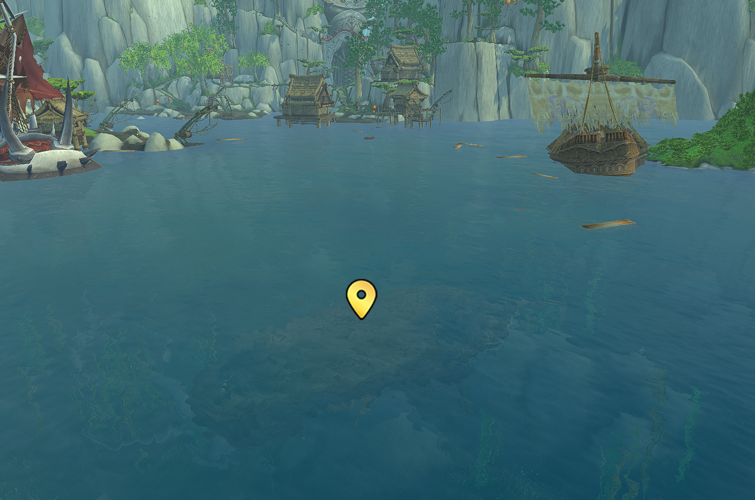 Dort findest du zunächst ein Schiff, das in einen Berg gekracht ist. Wichtig ist aber das zweite Wrack: etwas weiter östlich liegt ein Boot gekentert auf dem Meeresboden.