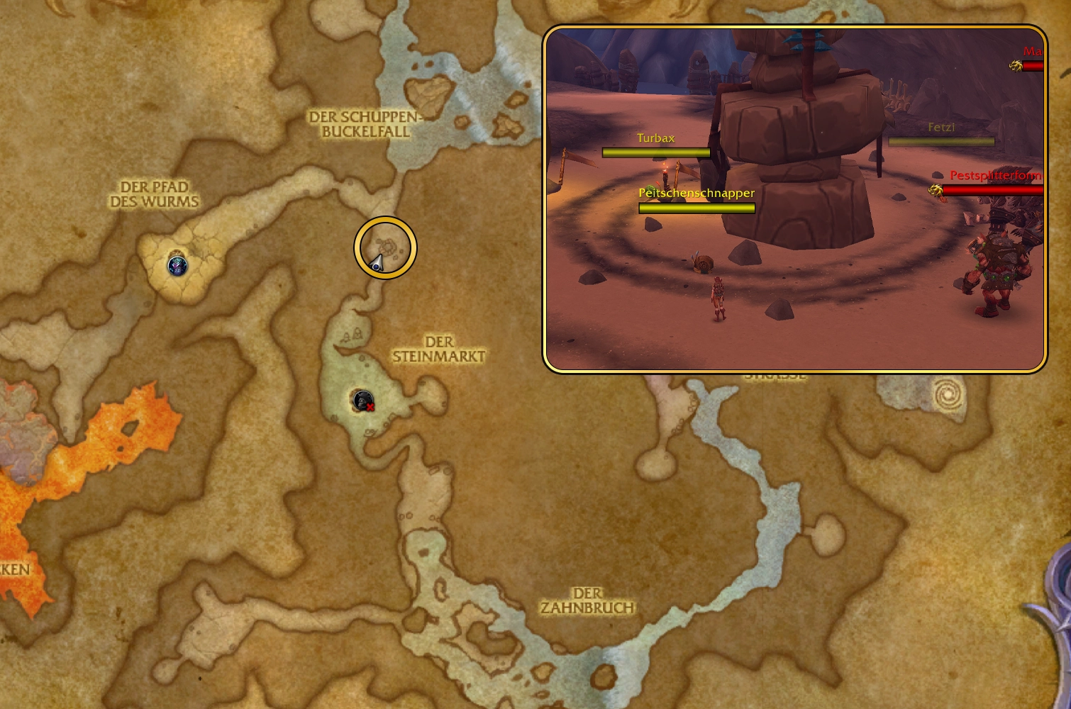 Hole dir die Ketchum-Tafel vom Pilzhändler (Mushroom Merchant). Betritt die Instanz, springe in das Loch hinunter, dann nach rechts – dort findest du einen kleinen Pfad (hinter dem Tauren), der nach unten und wieder nach oben führt, direkt zum Pilzhändler Kreis). Bei der Markierung (Pfeil) landet ihr.