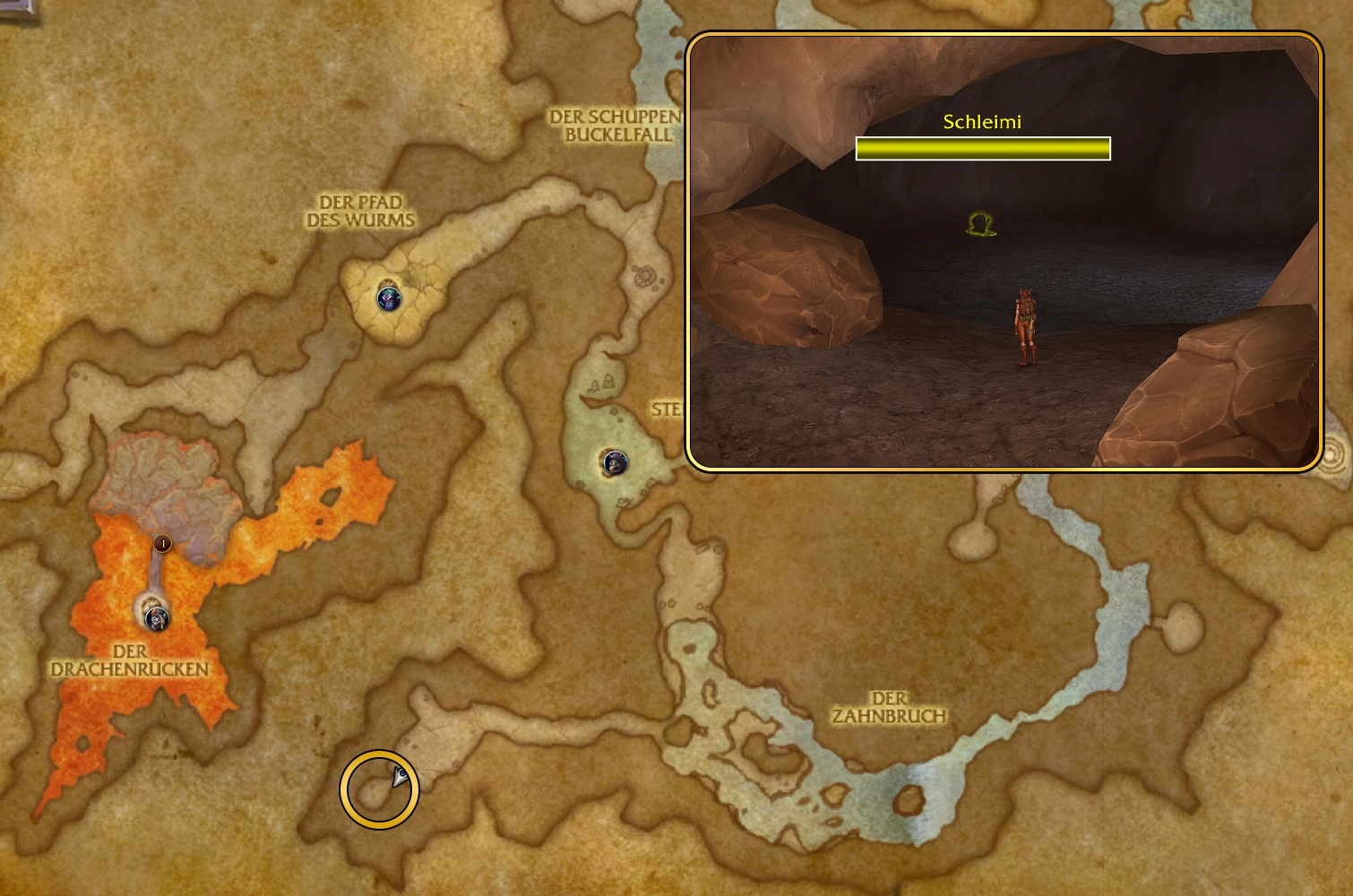 Weiter geht’s zur nächsten Stelle bei 31.4, 85.1 (siehe Markierung auf der Karte). Schleimi ist in der Höhle. Triff ihn mit der Tafel, sobald du ihn entdeckt hast.