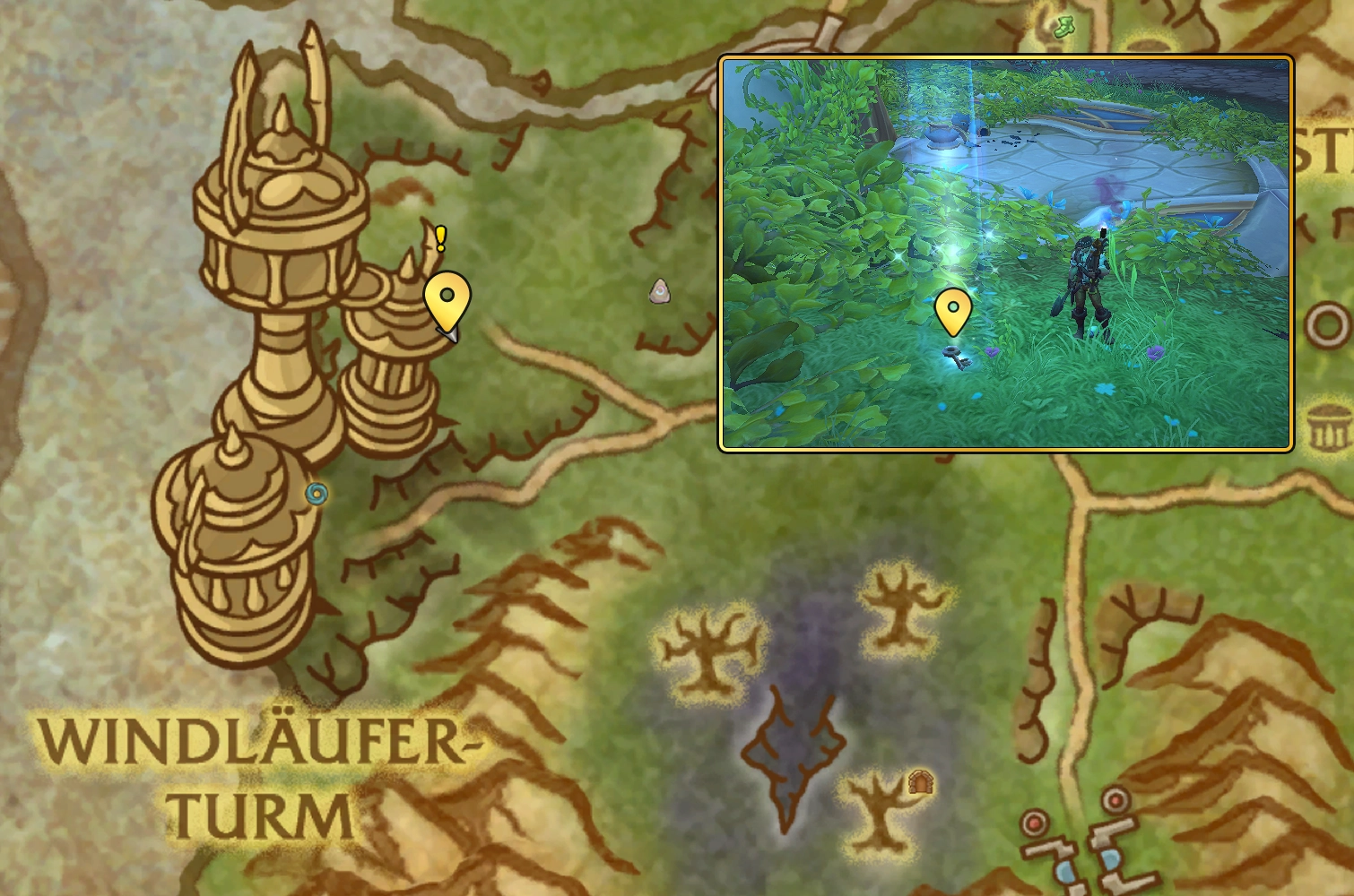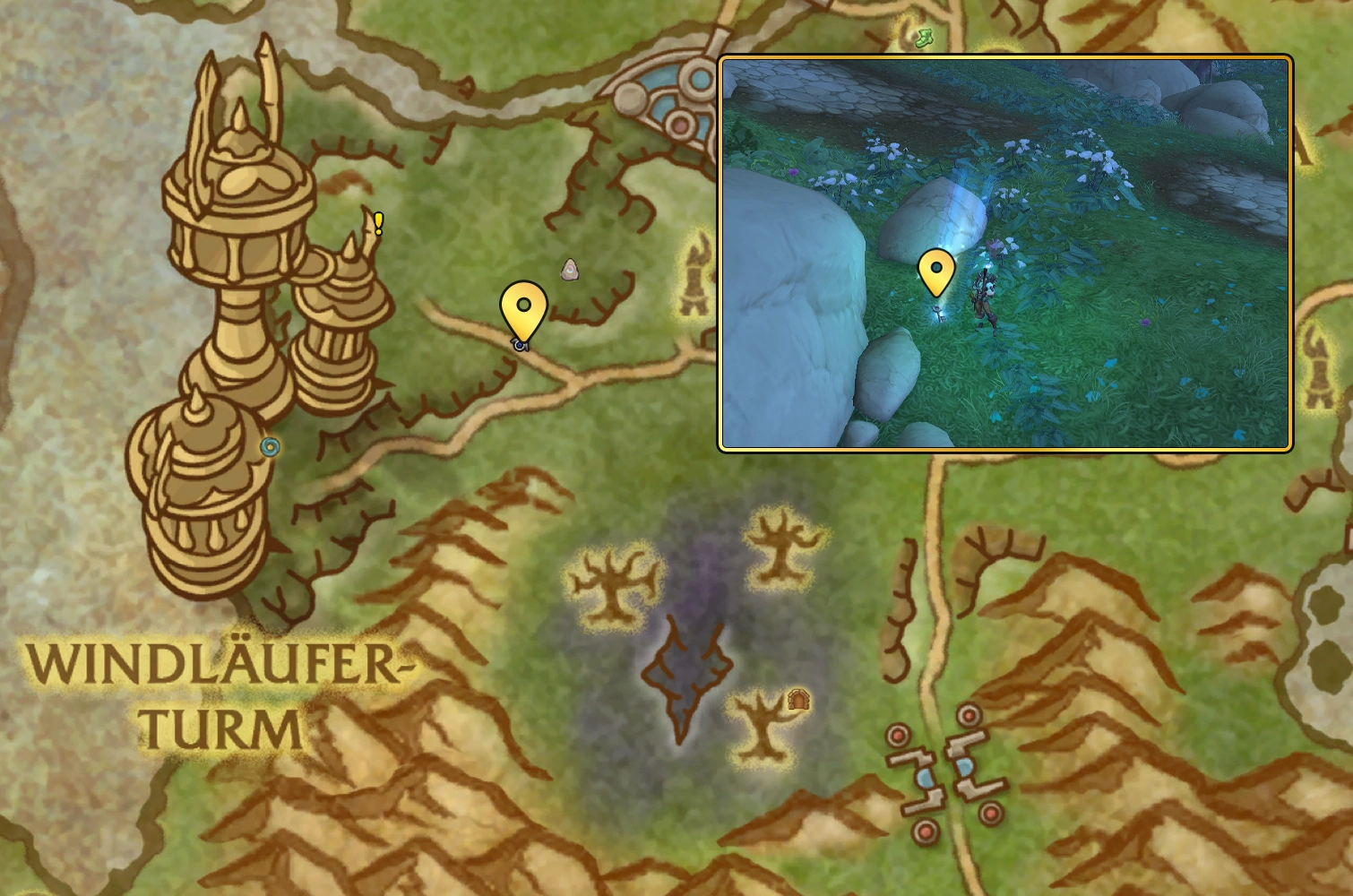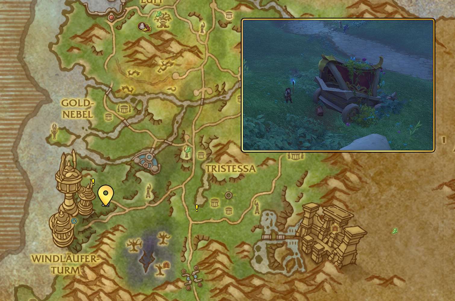 Ihr begebt euch dafür in den Immersangwald, genauer gesagt zum Windläuferdorf bei den Koordinaten /way #2395 38.89 76.09 . Dort findet ihr eine verschlossene Truhe neben einem Wagen. Bevor ihr jedoch nach den Schlüsseln suchen könnt, nehmt links daneben die Brennende Fackel auf. Diese fungiert als eine Art Detektor und macht die versteckten Schlüssel in der Umgebung sichtbar.