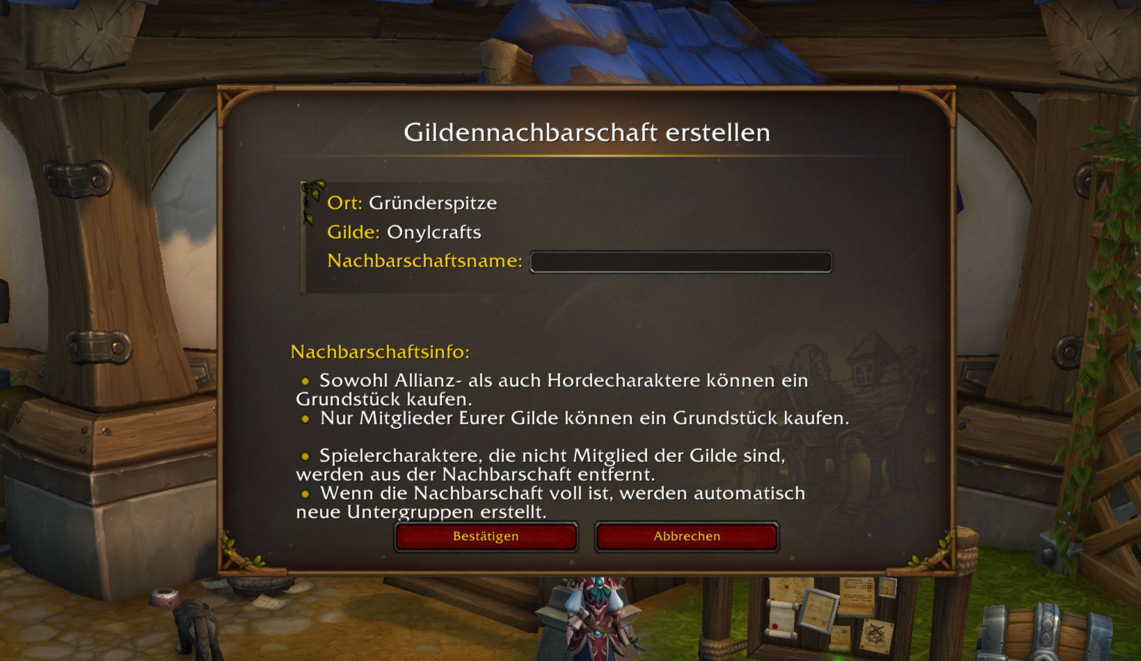 Gildennachbarschaften können nur von Gildenmeistern erstellt werden (die auf die Fraktion achten sollten). Alle Mitglieder der Gilde können dann in der Nachbarschaft ansiedeln. Seid ihr nicht mehr Teil der Gilde, könnt ihr natürlich auch nicht mehr in deren Nachbarschaft wohnen und müsst für euer Haus eine andere Nachbarschaft finden.