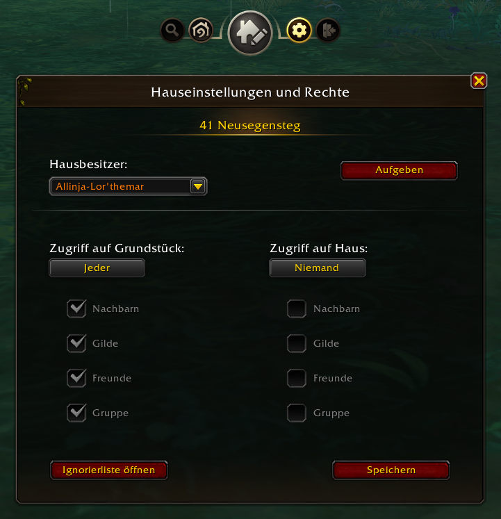 Das Zahnrad im Menü am oberen Bildschirmrand neben dem Hauseditor beherbergt die Einstellungen für das Hausrecht, wer euer Haus und euer Grundstück betreten darf oder nicht.