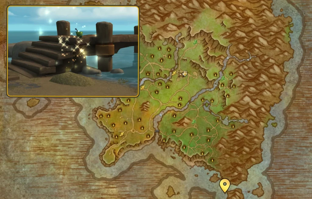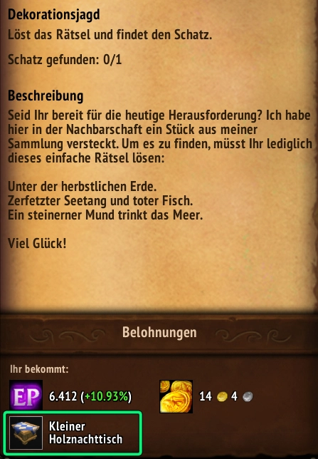 Um möglichst schnell den richtigen Ort eures Schatzes zu finden seht nach, mit welcher Dekoration ihr belohnt werden sollt (siehe Bild oben rechts) und sucht dann den Gegenstand in der nachfolgenden, alphabetisch sortierten Liste. Mit dem AddOn TomTom könnt ihr den kopierbaren /way-Befehl direkt ingame in den Chat posten und werdet zum richtigen Ort geführt.