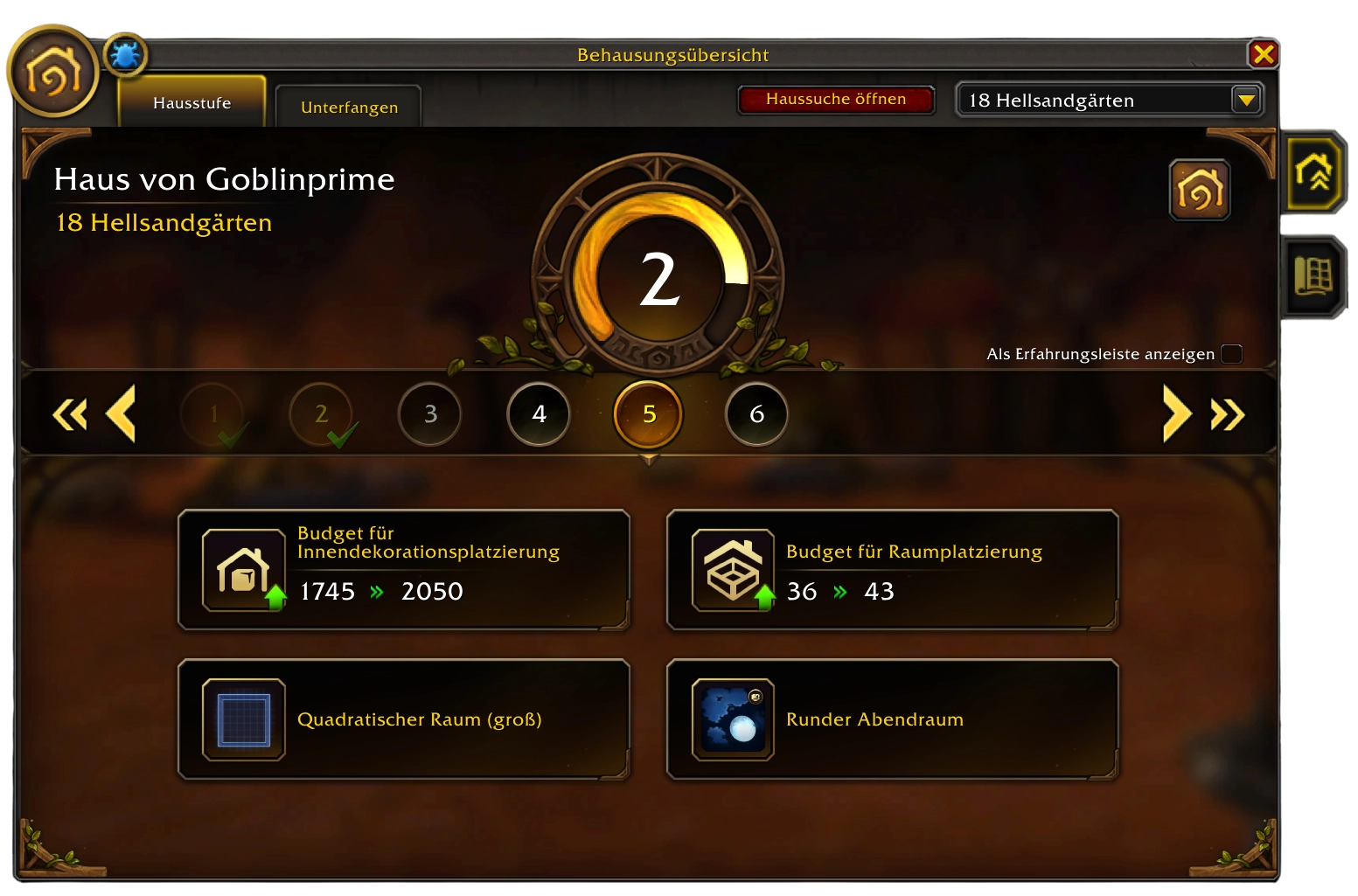 Das Housing verfügt über ein eigenes Fortschrittssystem aus mehreren Stufen – aktuell bis mindestens Level 6 . Mit jedem Levelaufstieg erhältst du: