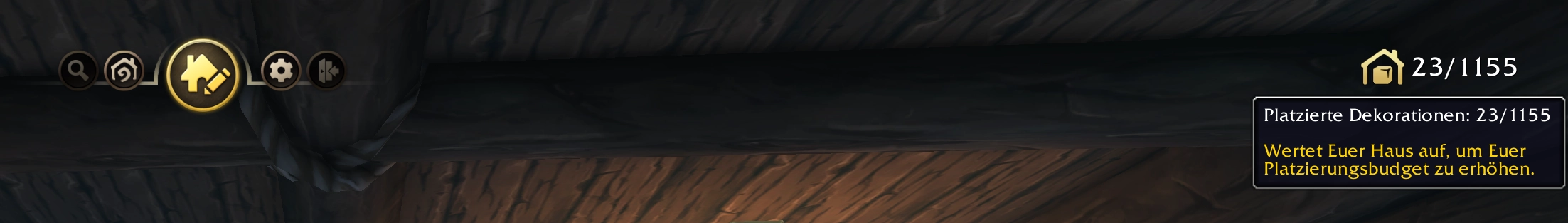 Jedes Housing-Grundstück – egal ob Horde oder Allianz – beginnt auf Level 1 und verfügt zunächst nur über begrenzten Platz für Dekorationen sowie wenige verfügbare Räume. Beim Öffnen des Bearbeitungsmodus siehst du oben rechts die Anzeige deiner verfügbaren Objektplätze, z. B. „0/1155“ .