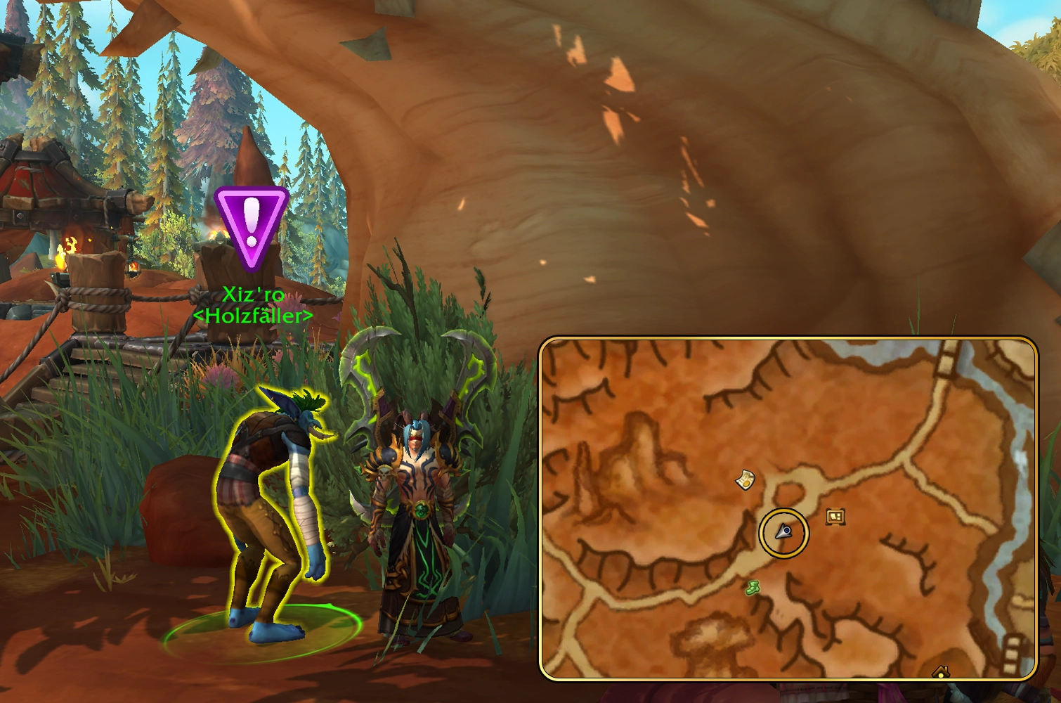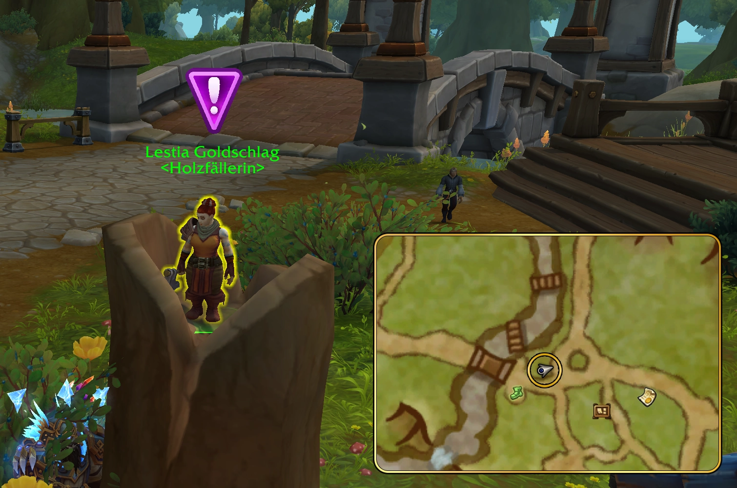 Damit ihr mit dem Holzfällen beginnt könnt, müsst ihr zur pinken Ausrufezeichenquest (Meta-Quest) in der Ortsmitte der Housing Zonen. Dort steht für die Allianz Lestia Goldschlag und für die Horde Xiz’ro. In der Ortsmitte befindet sich auch andere Händler sowie die Färbestation.